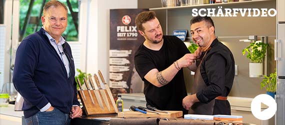 FELIX-Messer sind scharf. Und das für lange Zeit. Je nach Häufigkeit des Gebrauchs lässt die Schärfe einer Klinge mit der Zeit nach. Profis und Hobbyköche ziehen ihre Messer vor und nach jedem Gebrauch kurz ab, sprich: wetzen ihre Messer regelmäßig. Mit ein wenig Übung gelingt das auch Laien. Selbstverständlich können Sie uns Ihre FELIX-Messer zum Schärfen auch jederzeit zuschicken. Dieser Service ist kostengünstig und stellt sicher, dass Ihre Messer nach dem Schärfen wie neu sind.