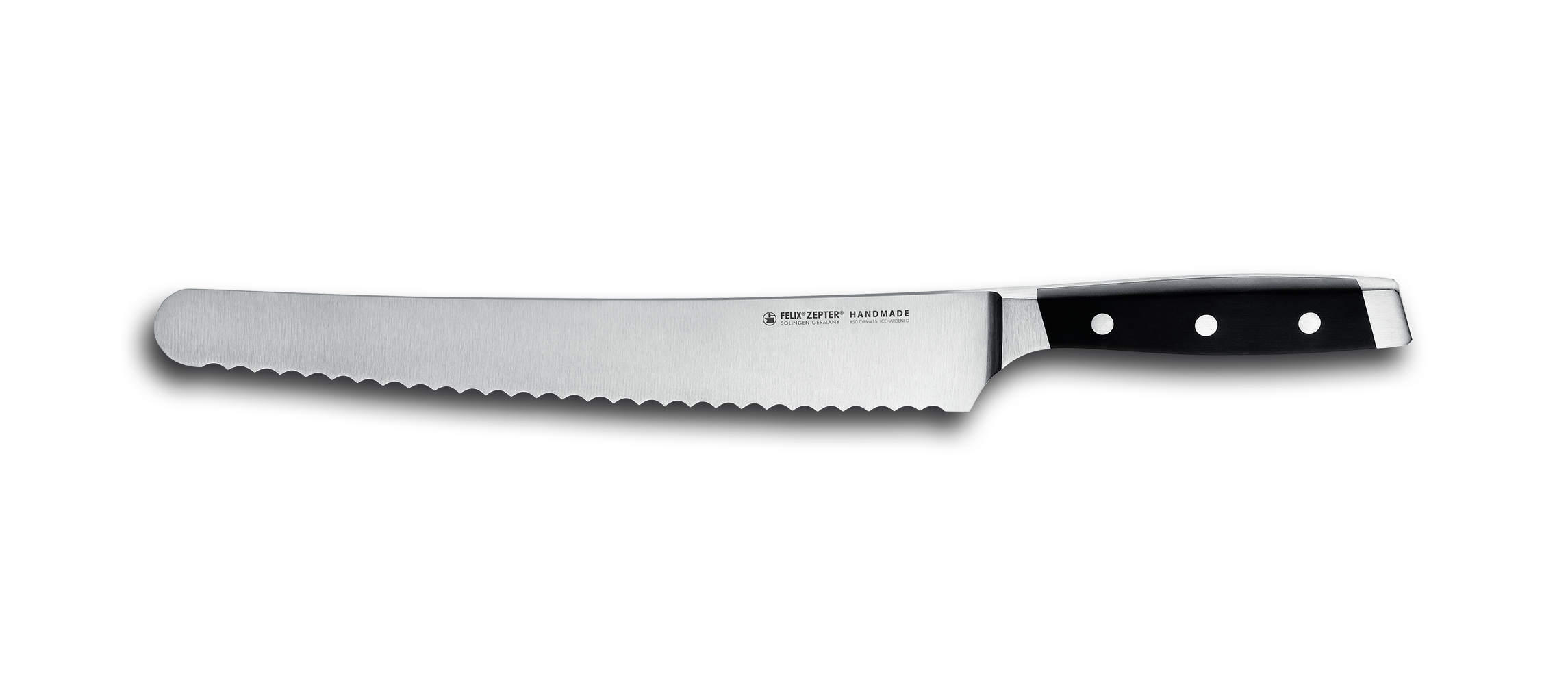 Dieses Brotmesser der Serie FIRST CLASS besticht durch sein außergewöhnliches, italienisches Design. Die besonders lange Klinge (26 cm) und die abgerundete Spitze machen es zu einem Design-Klassiker. Durch den speziellen Wellenschliff lassen sich harte Brotkrusten mühelos und gleichmäßig durchtrennen. Durch die spitzen Messer-Zähne wird das Schneidgut – beispielsweise auch Früchte mit einer härteren Schale oder Braten – angerissen. Das Messer gleitet mühelos durch Krusten oder Schalen.