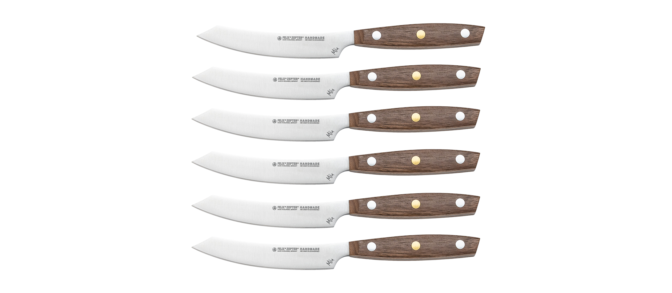 Die wunderschöne, leicht asiatisch angehauchte Klingenform ist ein absoluter Hingucker. Abgerundet werden die MIU Steakmesser durch ihren charmanten Walnussholzgriff und liegen einfach nur super in der Hand.