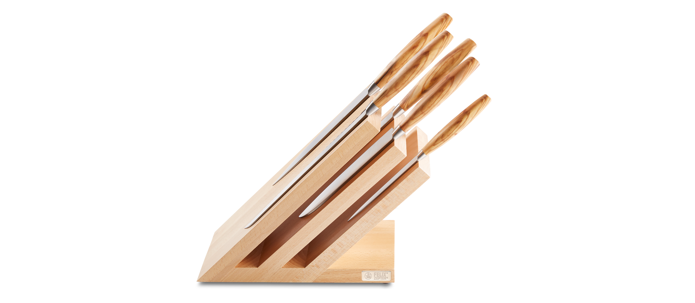 Dieses Messerblock-Set der Serie SIZE S Olive ist selbst für die kleinste Küche geeignet. Das Set enthält die wichtigsten Messer für den Küchenalltag: Spickmesser, Zubereitungsmesser, Kochmesser (18 cm), Santokumesser und Brotmesser. Mit diesen Werkzeugen können sowohl feinere als auch gröbere Schneidaufgaben gelöst werden. Fisch, Fleisch, Gemüse, Obst und Brot – alles wird mit den perfekt auf die Lebensmittel abgestimmten Messern verarbeitet. Der helle Holz-Magnetmesserblock ist nicht nur stylisch sondern passt auch in jede Küche. Er garantiert eine Aufbewahrung, die den Qualitätswerkzeugen von FELIX gerecht wird.