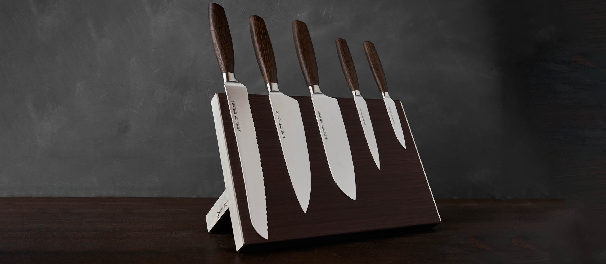 Set bestehend aus: Spickmesser, Gemüsemesser, Kochmesser (18cm), Santokumesser und Brotmesser sowie dem Magnetmesserblock Dunkle Eiche furniert