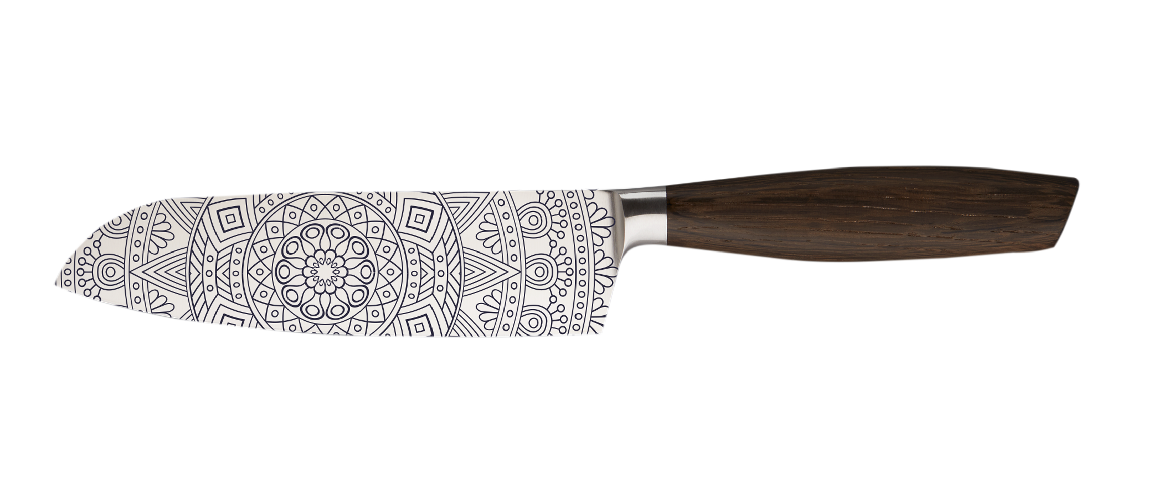Das Santokumesser der Serie SIZE S SMOKED OAK überzeugt durch sein traditionell japanisches Design. Besonders gut eignet sich das Messer zum Vorbereiten von Lachs, Schinken oder Gemüse. Hauchdünne Scheiben sind im Handumdrehen geschnitten. Dank der runden Warte können aber auch Kräuter fein gehackt werden. Das Mandala ist ein Schaubild mit magischer Bedeutung. Mit dieser Lagergravur wird Ihr Messer zum Kultobjekt.