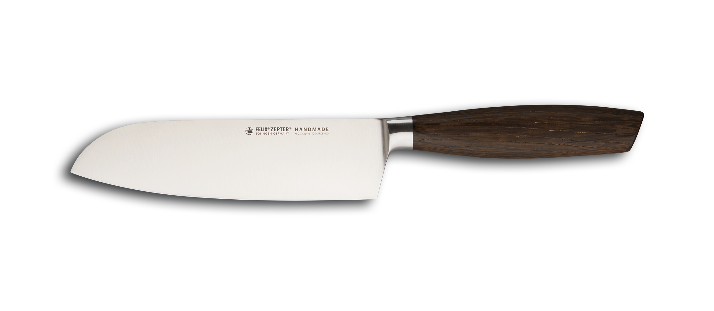 Das Santokumesser der Serie SIZE S SMOKED OAK überzeugt durch sein traditionell japanisches Design. Die breite Klinge ermöglicht den direkten Transport des Schneidgutes in die Pfanne und mit der leicht gerundeten Warte können Sie Kräuter sehr fein hacken. Dieses Messer ist ein wahrer Alleskönner. -