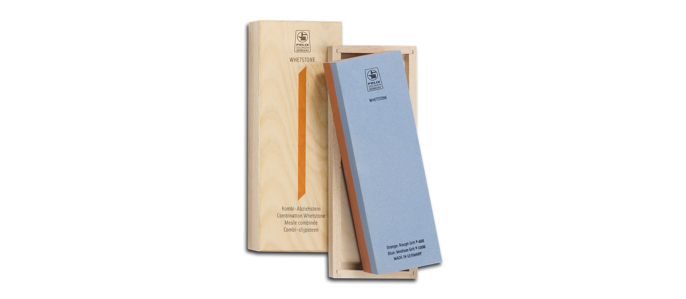 FELIX-Messer sind für lange Zeit scharf. Doch auch sie müssen irgendwann nachgeschärft werden. Eine besonders einfache und schonende Art des Schleifens ist das Nachschärfen mit dem Kombi-Abziehstein. Er kombiniert verschiedene Schleifkörnungen miteinander. Zwei Seiten für zwei Schleifschritte: Mit der groben Seite des Abziehsteins werden Unebenheiten abgeschliffen. Der Feinschliff erfolgt mit der zweiten Seite: Damit schärfern Sie das Messer präzise und polieren zum Abschluss die Schneide.