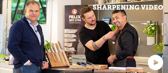 Depending on the frequency of use, the sharpness of a blade decreases over time. Professionals and hobby chefs pull off their knives briefly before and after each use, i.e. sharpen their knives regularly. With a little practice, even amateurs will succeed. Of course, you can also send us your FELIX knives (except scissors and knives with serrated edge) for sharpening at any time. This service is free and ensures that your knives are as good as new after sharpening.